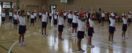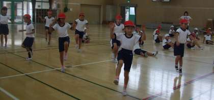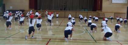 2年生のダンスの練習です。前田先生に教わりながら、音楽にのって、みんな一生懸命に練習しています。