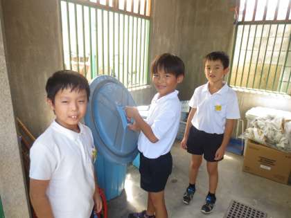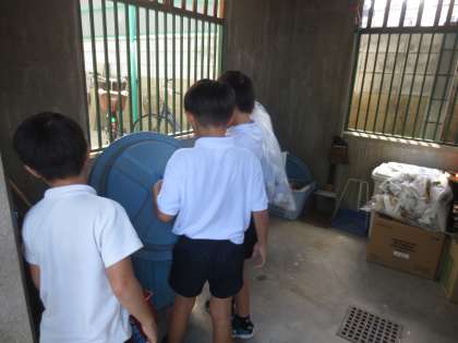 9/8(金)教室の掃除が終わり、仲よく3人でゴミを持ってきました。なんだか・・・楽しそうです。