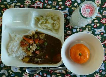 ビーフカレーライス(米粉)、キャベツのピクルス、みかん(冷)、牛乳