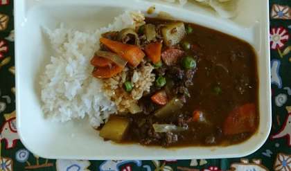 子どもに大人気のカレーライスです。9月は小麦アレルギーの児童も食べられる米粉のカレールウを使っています。