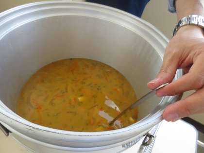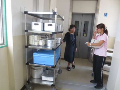 小学校の栄養教諭 松廣先生が、中学校の教頭先生から改善点等をきいています。また、給食の状況も見学しています。