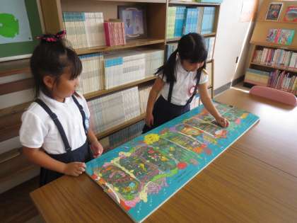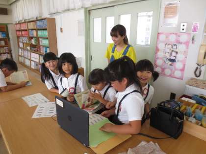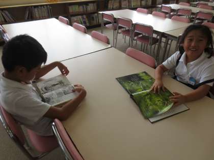 木曜日は、学校図書ボランティアの大久保さんに来ていただいています。お手伝いと言ってカウンターの中で本を読んでいるのは、1年生たちです。