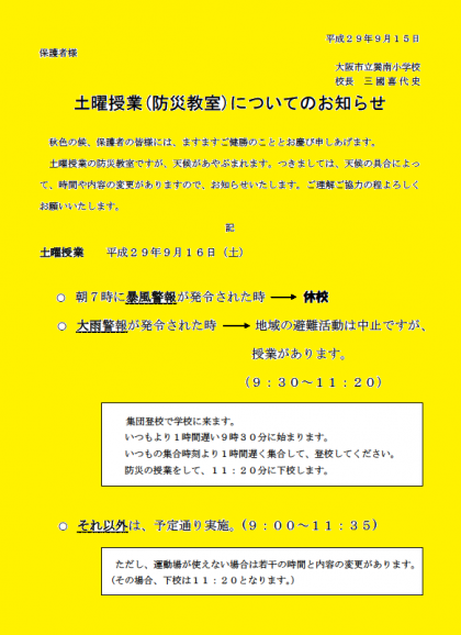 ●大雨警報の発令・・・地域防災訓練は中止。土曜授業は実施。午前9:30〜 ただし、降雨の状況により安全でない場合は登校を控えて下さい。(メール配信あり)