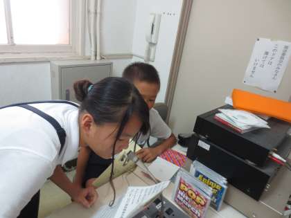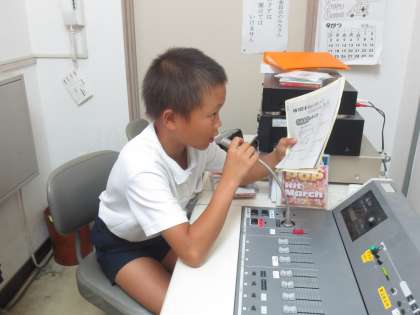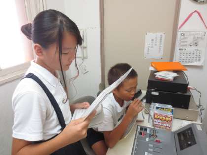 毎週金曜日、給食の時間に英語で献立を紹介します。まず放送委員会の児童が英語で・・・そのあと、英語のカーン先生が同じ献立を英語で紹介します。
