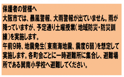 大阪市では、暴風警報、大雨警報が出ていません。雨が降っていますが、予定通り土曜授業(地域防災・防災訓練)を実施します。