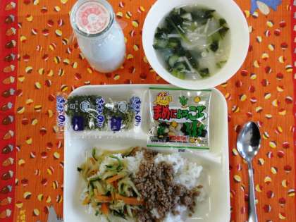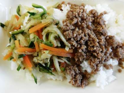 牛挽肉、豚挽肉を甘辛くいためたものと、きゅうり、にんじん、切り干しだいこんをナムルにしたものをご飯の上にのせて食べます。