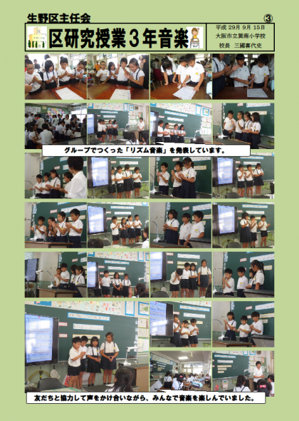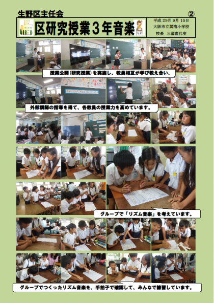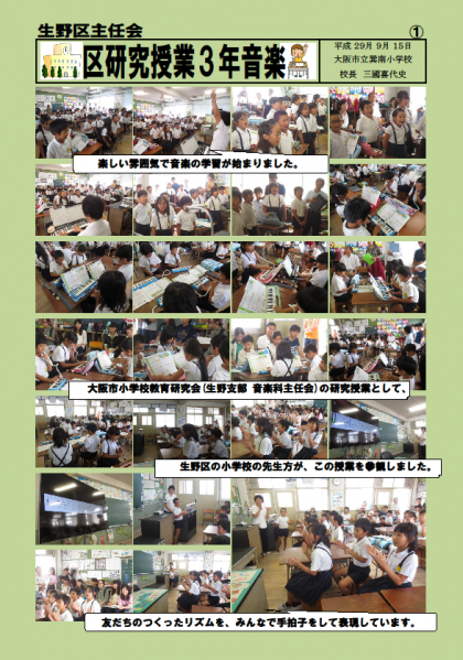 9/15校内において授業公開(研究授業)を実施しました。授業を参観することで教員相互が学び教え合い、また、外部講師の指導を得て、各教員が授業力を高める機会にしています。今回は大阪市小学校教育研究会(生野支部 音楽科主任会)の研究授業として実施しましたので、他の小学校の多くの先生方がこの授業を参観しています。右記の配布文書に様子を載せております。ご覧下さい。