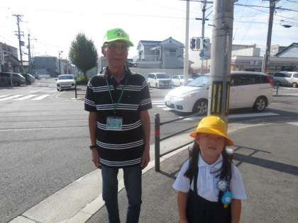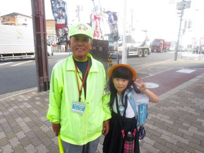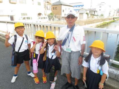 子どもたちは笑顔で「あいさつ」していました。「見守り隊」の方々も笑顔で声かけをしてくださっていました。