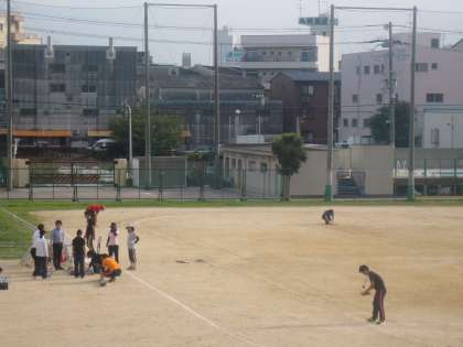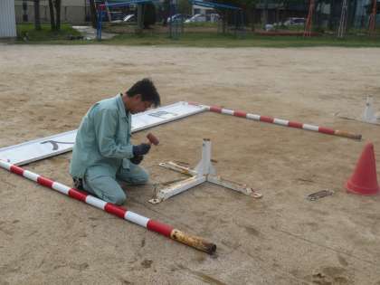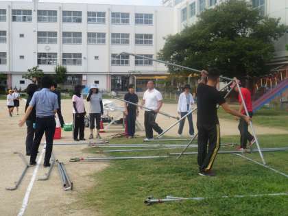 2週間前になった運動会の準備です。本部テントや入退場門の設置をしています。