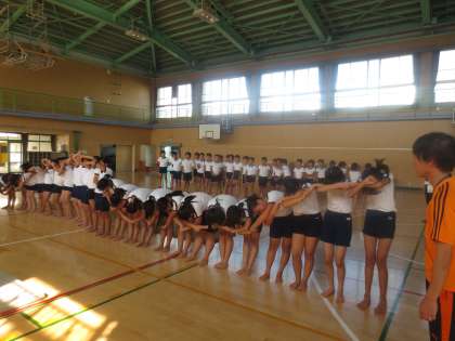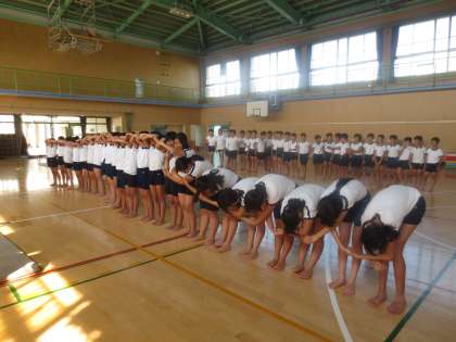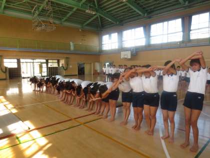 9/19(火)体育館でウェーブの練習をしています。みんなで動きを合わせ、少しずつ動きをずらせてウェーブを表現しています。