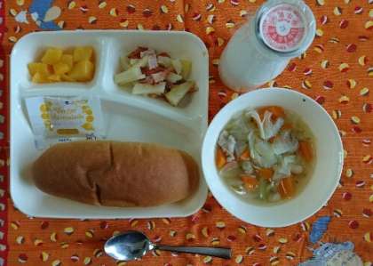 鶏肉とてぼ豆のスープ煮、じゃがいもとトマトのチーズ焼き、黄桃(缶)、コッペパン、マーマレード、牛乳