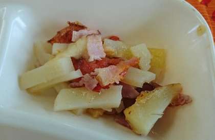 ベーコン、じゃがいも、トマトを混ぜ、とろけるチーズをかけて焼きます。