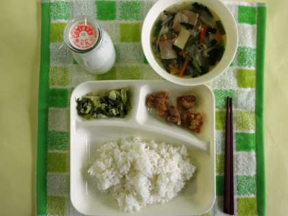 鶏肉のからあげ、中華スープ、キャベツと三度豆の甘酢あえ、ご飯、牛乳