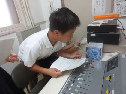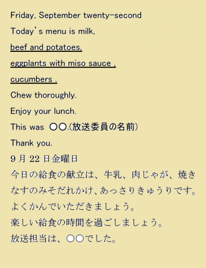 毎週金曜日、給食の時間に英語で献立を紹介します。まず放送委員会の児童が英語で・・・そのあと、英語のカーン先生が同じ献立を英語で紹介します。