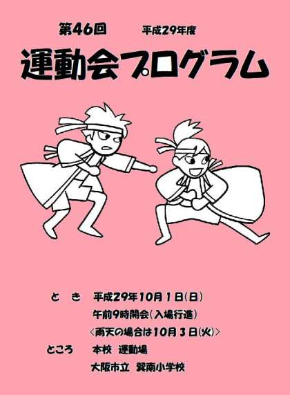 本日、第46回 運動会のプログラムを配付しました。子どもさんの出場する種目をご確認下さい。後日、学年ごとに出場する順番や位置などをプリントにしてお配りいたします。