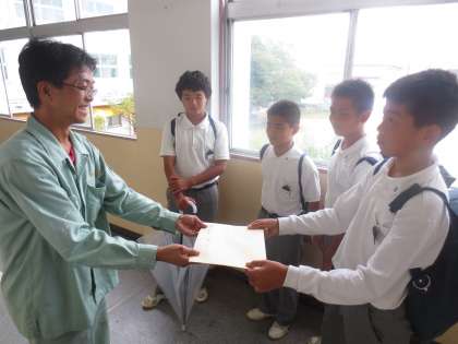 9/22(金)新巽中学校の生徒が、先日の職場体験のお礼に来ました。丁寧に2日間のお礼を言いました。4名の生徒はとても礼儀正しく、指導をした管理作業員さんもほめていました。