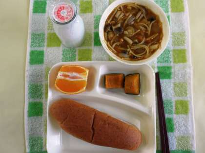 カレースープスパゲッテイ、かぼちゃのバター焼き、デコポン、ライ麦パン、牛乳