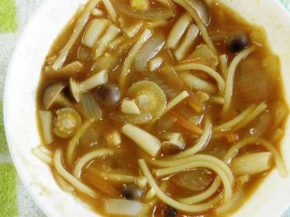 鶏肉、ベーコンの入ったカレー味のスープスパゲッティです。