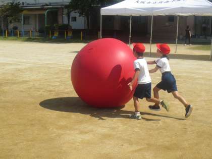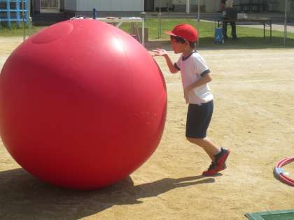 自分よりも大きな玉を、友だちと協力しながらころがしていきます。思い通りに進んでくれません。でも力いつぱい取り組んでいます。