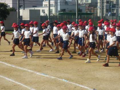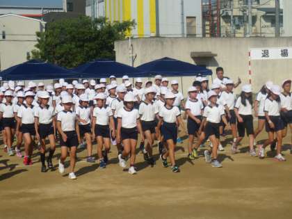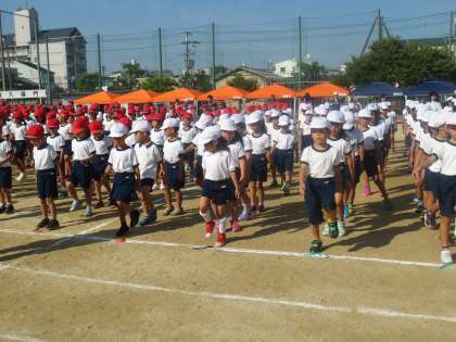 今日は閉会式の練習をしています。児童がテント席から入場行進をしています。