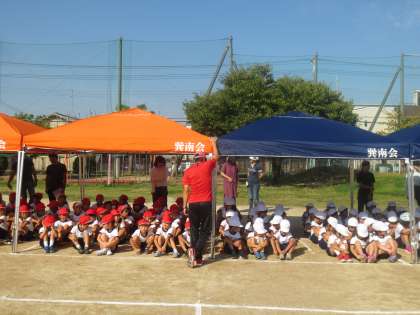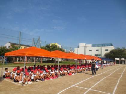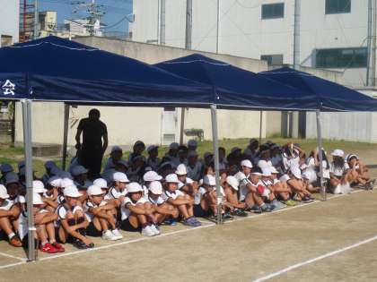 1時間目 運動会の全体練習をしました。全児童がテント席にすわっています。