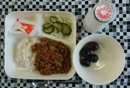 ドライカレー(米粉)、グリーンサラダ(ノンエッグドレッシング)、ぶどう(巨峰)、牛乳