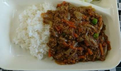 牛挽肉、豚挽肉を主材にしたドライカレーです。今月は米粉のカレールウを使っています。