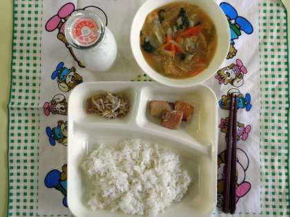 さけのつけ焼き、みそ汁、もやしのいためもの、ご飯、牛乳