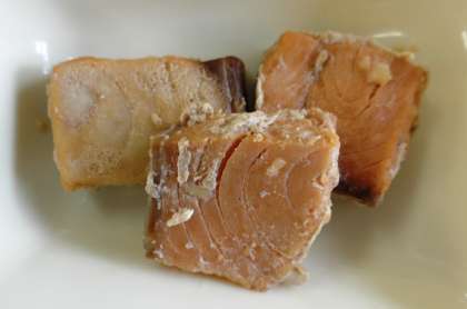 角切りのさけににんにく、料理酒、みりん、こい口しょうゆで下味をつけ焼いています。