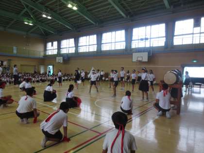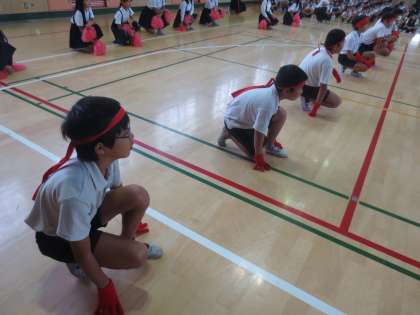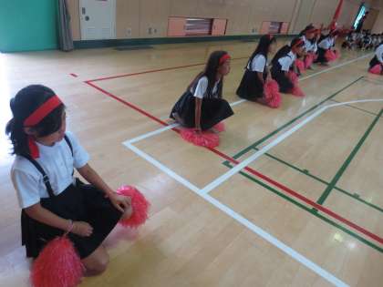 1〜6年生の全員が声をだし、応援合戦の練習をしています。友だちやみんなが、力いっぱい頑張れるように応援の声をだしていました。