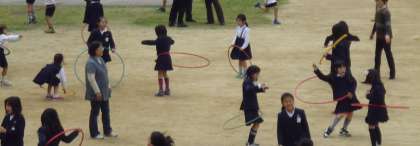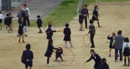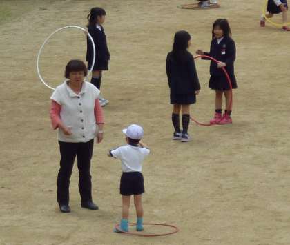 20分休憩、はぐくみネットの方が、プラフープ遊びを教えてくださいました。ちょうど雨が止んでいて、一生懸命プラフープを練習しているお友達がたくさんいました。