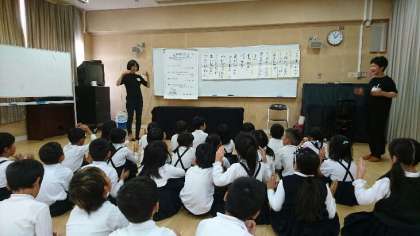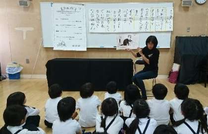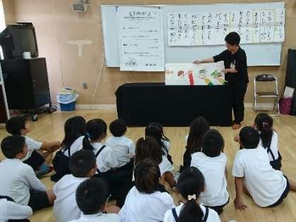 10月5日(木)多目的室で、2年生のお話会がありました。生野図書館「あじさいブッククラブ」の方が、次の作品を読み聞かせしていただきました。絵本『だんまりこおろぎ』絵本『シラユキさんとあみあみモンスター』紙芝居『くじらやま』大型絵本『しりとりのだいすきなおうさま』です。途中で、「うまいもんのうた」を歌いながら、体ほぐし体操をしました。読み聞かせは、楽しいものばかりでした。