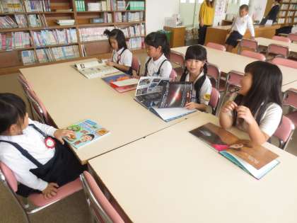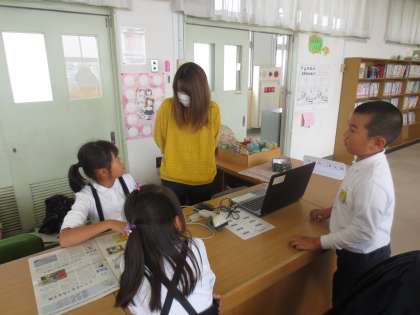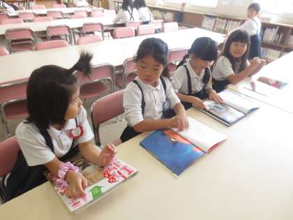 木曜日は、学校図書ボランティアの大久保さんに来ていただいています。おおぜいの子どもたちが図書館に来ていました。
