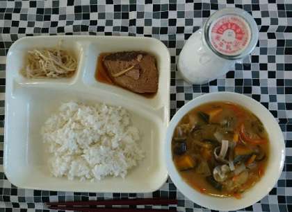 なまりぶしのしょうが煮、みそ汁、もやしのごまあえ、ご飯、牛乳