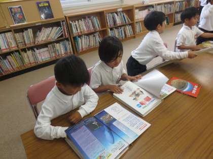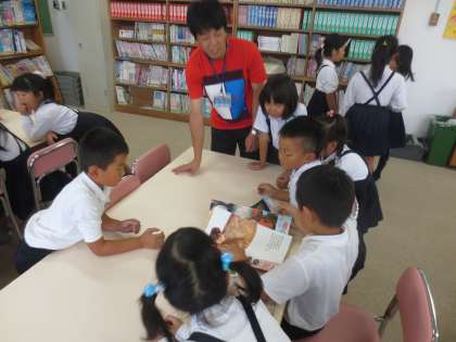 木曜日は、学校図書ボランティアの大久保さんに来ていただいています。おおぜいの子どもたちが図書館に来ていました。