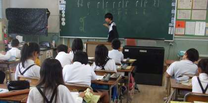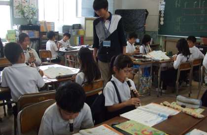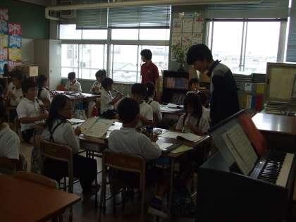 新巽中学校から、3・4年生の音楽を指導に来てくれている先生が変わりました。名前は、牛丸弦太先生です。