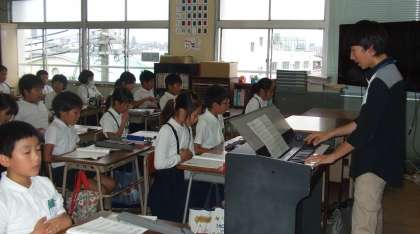 4年生の音楽は、今日初めて牛丸先生といっしょに勉強しました。