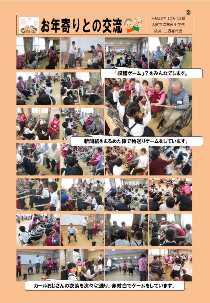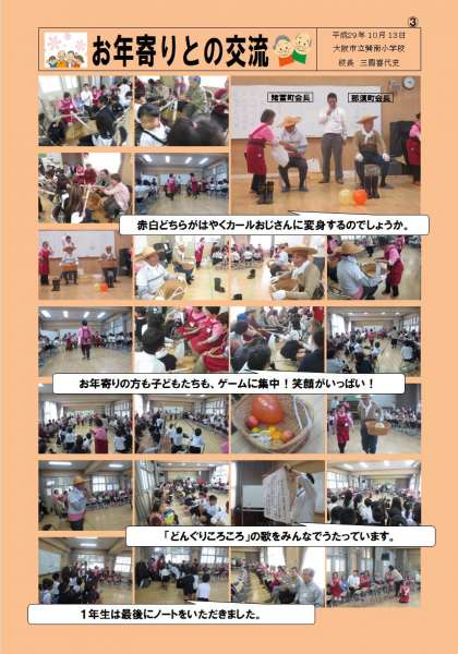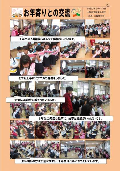 10/13(金)地域のお年寄りの方々との交流をしました。1年生は、ピアニカの合奏と運動会の歌を、とても上手に元気よく発表しました。お年寄りの方々は、元気で可愛い子どもたちの演技に、笑顔で大きな拍手を送っていました。