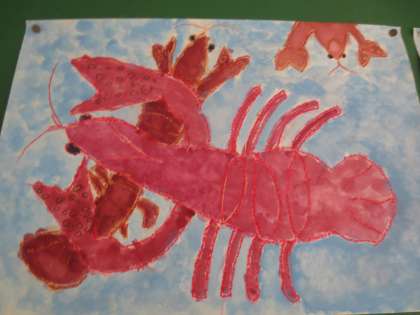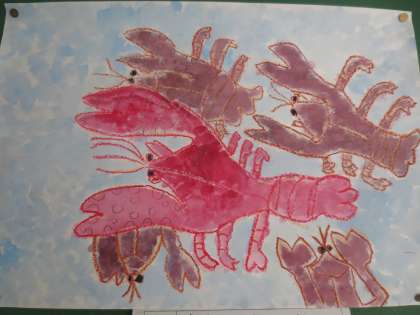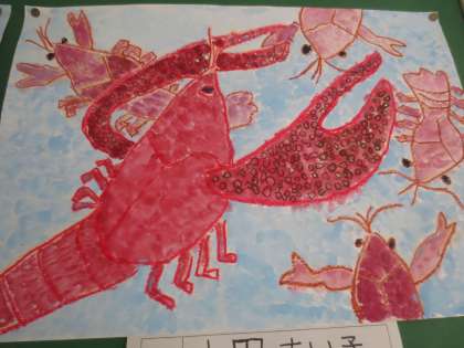 子どもたち一人一人が、ちがう顔をしたアメリカザリガニを描いています。とても力強く迫力があるアメリカザリガニです。