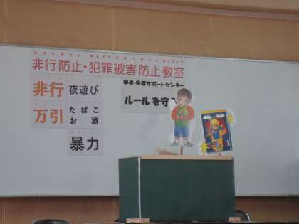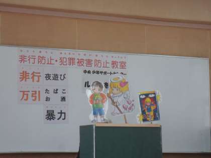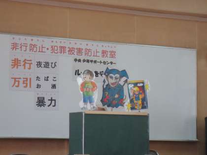 ペープサート(紙人形劇)を活用し、「万引きは犯罪であることを理解する」「万引きをした時の、お家の人や被害者の気持ちを考える」「誘われたときに断る勇気を持つ」「ルールを守ることの大切さを理解する」ことなど、「非行の入口」とも言われる万引き防止を中心とした内容を指導していただきました。