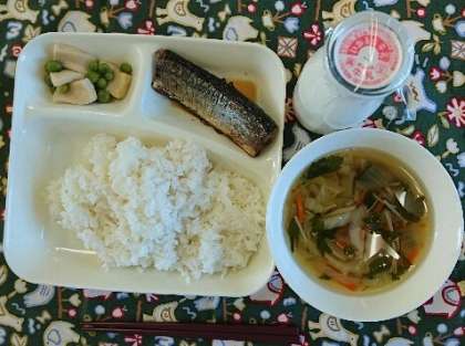 さんまのさんしょう焼き、すまし汁、高野どうふの煮もの、ご飯、牛乳