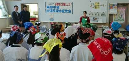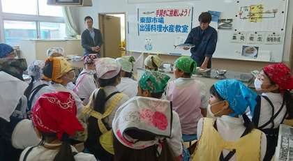 10月27日(金)5時間目、6時間目に家庭科室で、5年2組の児童が出前授業をしました。今日は、東部市場の方々と大地の会(大阪府栄養士会)の栄養士の方々による「手開きに挑戦しよう!東部市場出張料理水産教室」を実施しました。
