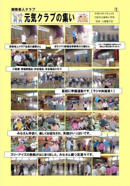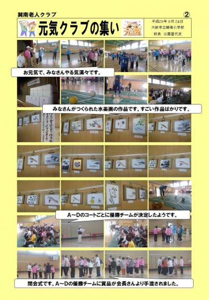 9/24(日)に開催された巽南地域「元気クラブの集い」の様子です。遅くなりましたが載せていますのでご覧下さい。はじめに巽南老人クラブ会長の藤原さん、巽南まちづくり協議会理事長の川端さんの挨拶がありました。青少年福祉委員・青少年指導員・スポーツ推進委員の方々が協力され、スムーズに進行されておりました。各チームがスリーアイズに意欲的に挑んでおられました。「見守り隊」の方々も多く参加されており、若々しく活動される姿に、こちらの方が元気をいただきました。