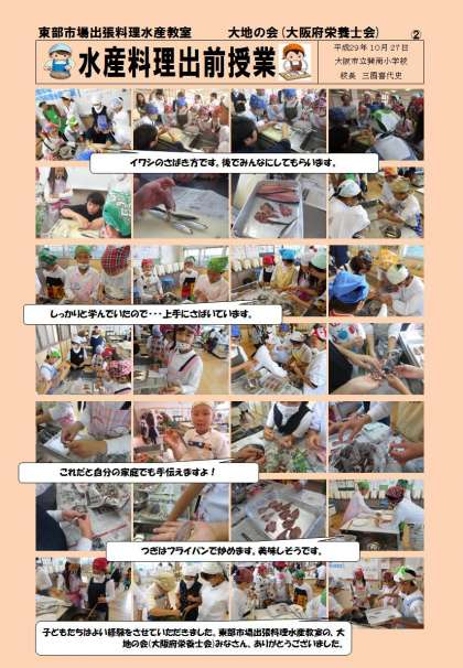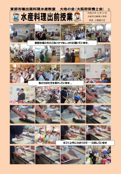 10/27(金)東部市場と大地の会(大阪府栄養士会)の方々に、出前授業(水産料理)をしていただきました。子どもたちは、魚料理の仕方を模範で見せていただき、見事な手さばきに驚いていました。この後、グループごとに子どもたちは「いわし」料理にチャレンジしました。