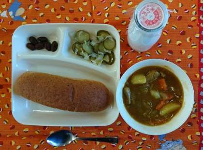 豚肉と野菜のカレー煮、サワーサラダ、うずら豆のグラッセ、ライ麦パン、牛乳