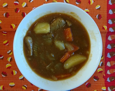 豚肉、じゃがいも、たまねぎ、にんじんを使ったカレー味のスープ煮です。