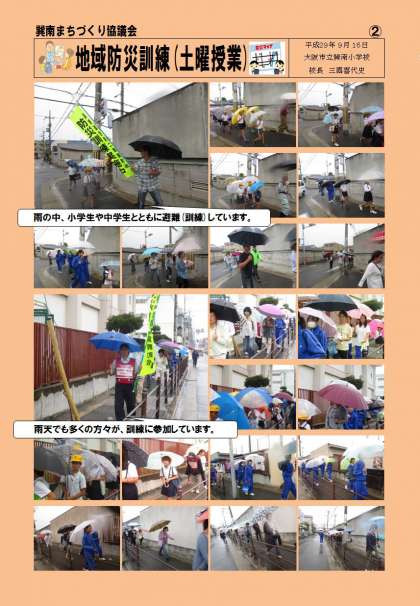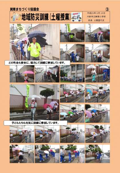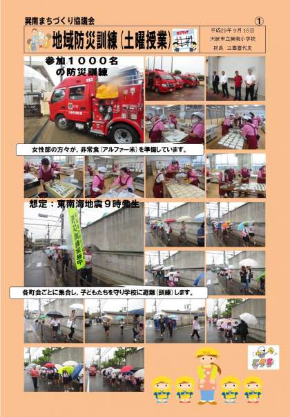 巽南地域と小中学校とが連携した防災訓練を9月16日(土)に実施しました。この取り組みを通して子どもたちは、自分で守る「いのち」、協力して守る「いのち」、その「いのち」の大切さを学びました。左下の配布文書に記録写真を載せています。ご覧下さい。