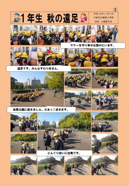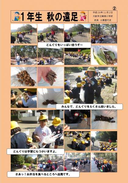 11/2(木)1年生は遠足で長居公園に行きました。どんぐり拾いをして、大阪市自然史博物館を見学しました。遠足の様子を載せています。ご覧ください。