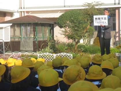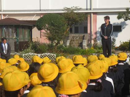 松廣先生より今週の生活目標等のお話がありました。11月の生活目標は「すすんであいさつをしよう」です。校長先生より世界の食糧不足についてのお話がありました。