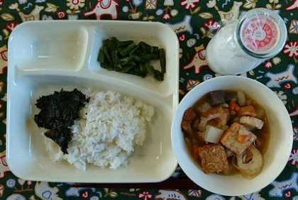 関東煮、三度豆のからしあえ、のりのつくだ煮、ご飯、牛乳